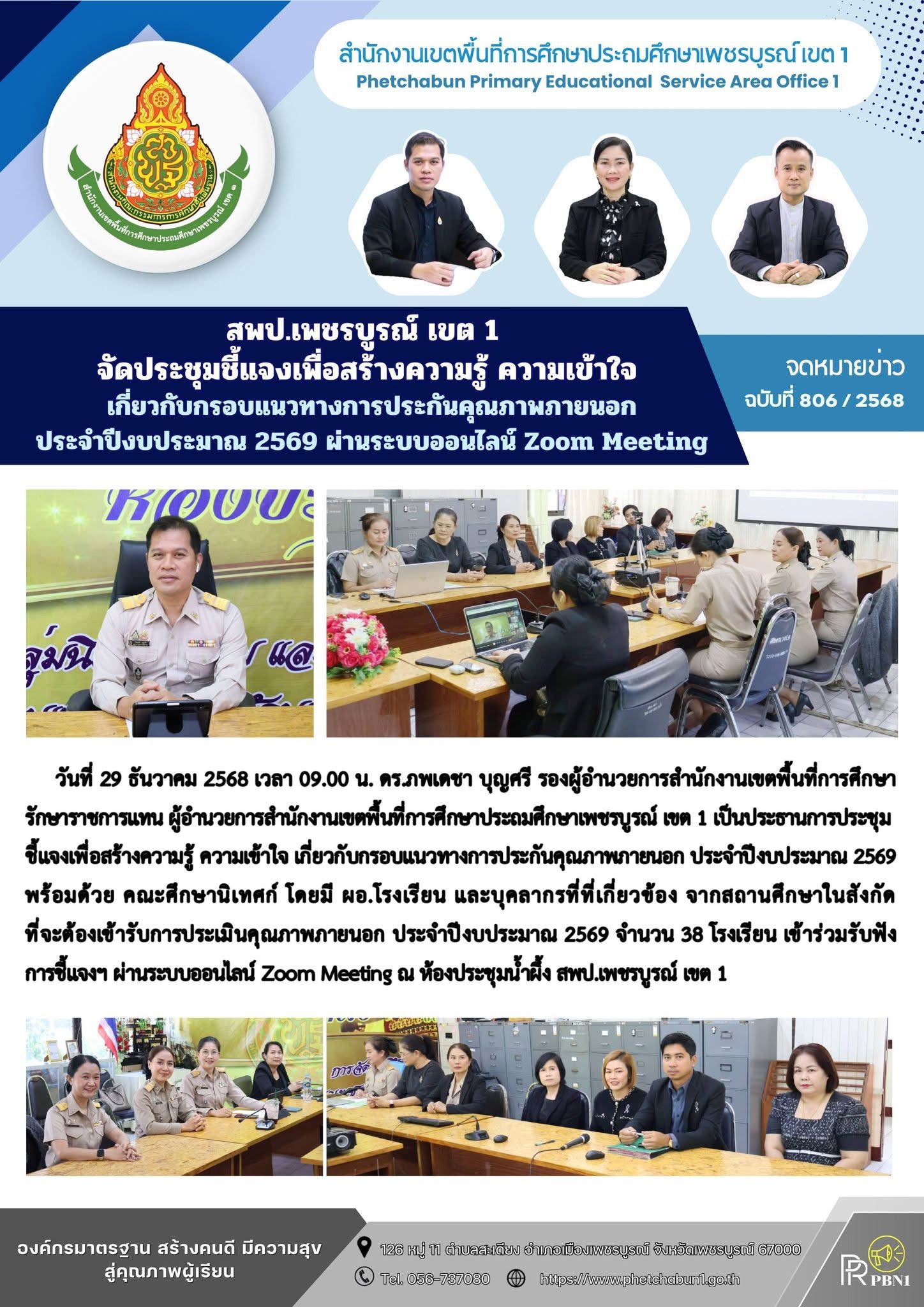 สพป.เพชรบูรณ์ เขต 1 จัดประชุมชี้แจงเพื่อสร้างความรู้ ความเข้าใจ เกี่ยวกับกรอบแนวทางการประกันคุณภาพภายนอก ประจำปีงบประมาณ 2569 ผ่านระบบออนไลน์ Zoom Meeting