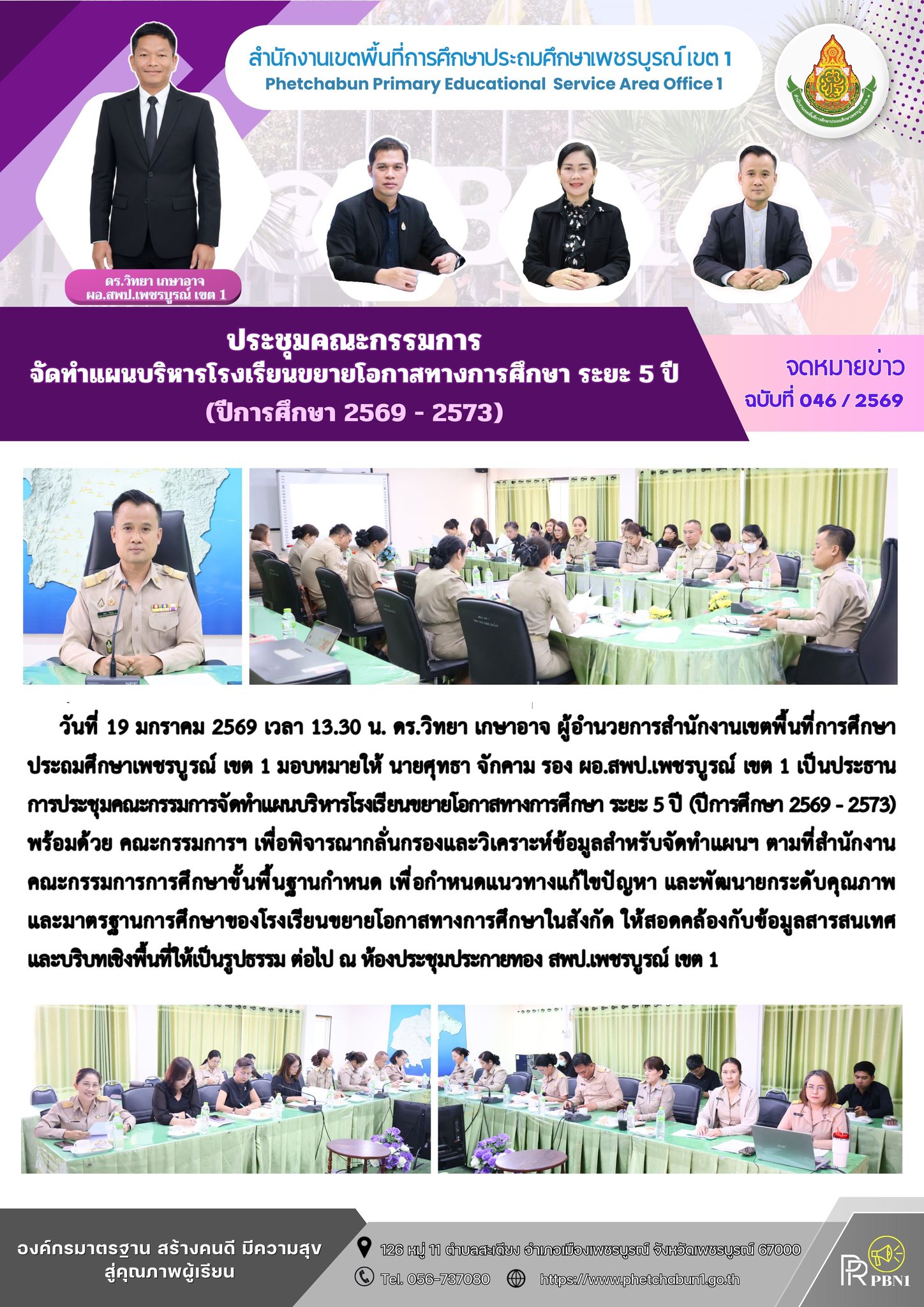 19 มกราคม 2569 เวลา 13.30 – ดร.จิรันธนิน คงจีน ศึกษานิเทศก์ชำนาญการพิเศษ เข้าร่วมประชุมคณะกรรมการจัดทำแผนบริหารโรงเรียนขยายโอกาสทางการศึกษา ระยะ 5 ปี (ปีการศึกษา 2569 - 2573) โดย ดร.วิทยา เกษาอาจ ผู้อำนวยการสำนักงานเขตพื้นที่การศึกษาประถมศึกษาเพชรบูรณ์ เขต 1 มอบหมายให้ นายศุทธา จักคาม รอง ผอ.สพป.เพชรบูรณ์ เขต 1 เป็นประธานการประชุมคณะกรรมการจัดทำแผนบริหารโรงเรียนขยายโอกาสทางการศึกษา ระยะ 5 ปี (ปีการศึกษา 2569 - 2573) พร้อมด้วย คณะกรรมการฯ เพื่อพิจารณากลั่นกรองและวิเคราะห์ข้อมูลสำหรับจัดทำแผนฯ ตามที่สำนักงานคณะกรรมการการศึกษาขั้นพื้นฐานกำหนด ในการดำเนินการกำหนดแนวทางแก้ไขปัญหา และพัฒนายกระดับคุณภาพและมาตรฐานการศึกษาของโรงเรียนขยายโอกาสทางการศึกษาในสังกัด ให้สอดคล้องกับข้อมูลสารสนเทศ และบริบทเชิงพื้นที่ ให้เป็นรูปธรรมต่อไป ณ ห้องประชุมประกายทอง สพป.เพชรบูรณ์ เขต 1